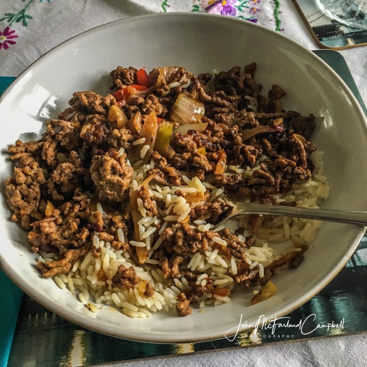 So, we had savoury mince with peppers, onion, and coriander. I also added a small amount of HP sauce and boiled some rice to go with it. I think it was a success as our guest finished his plate.