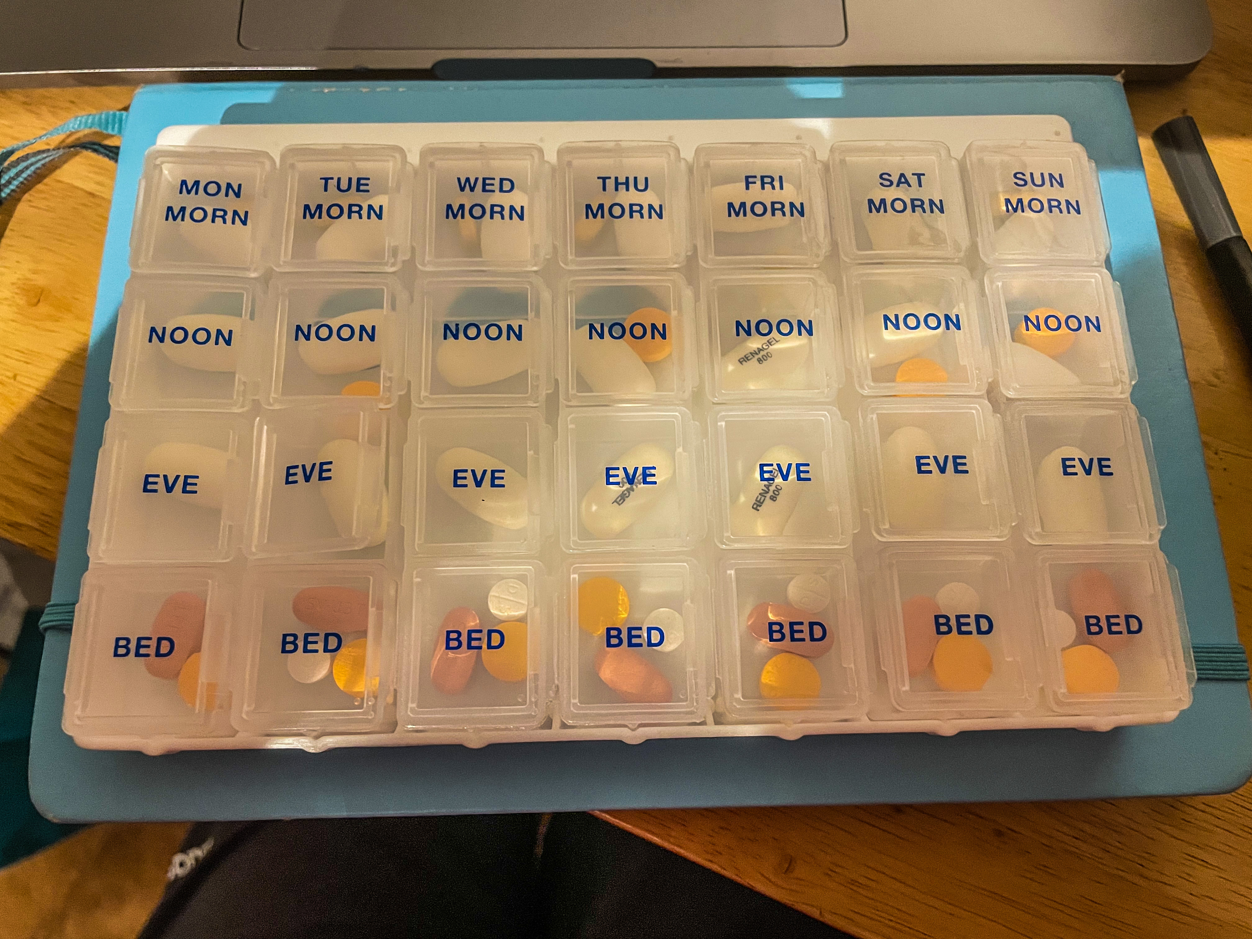 As part of this, I have just spent a few minutes boxing all the meds for the coming week in a handy seven-day pill box.